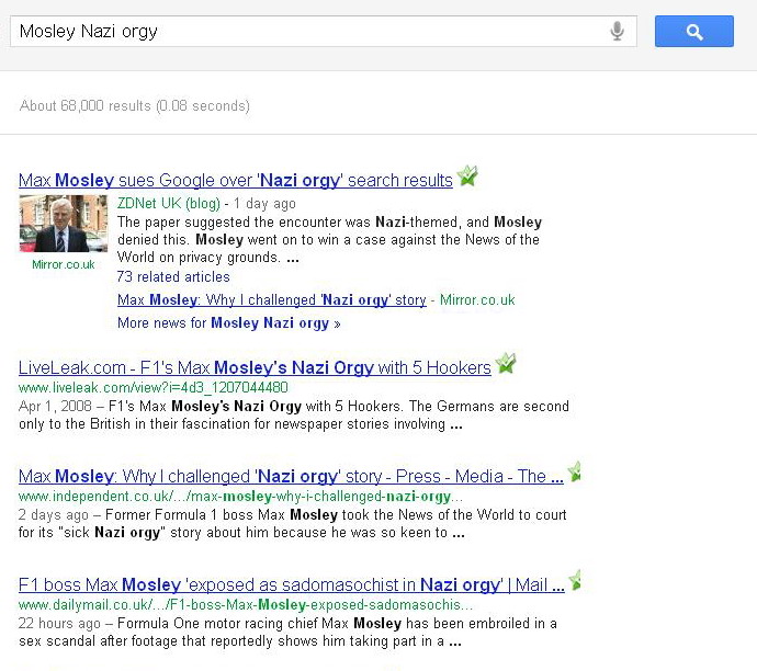 Discussing what happened in this case is important, and I wouldn’t want to see all discussion of it or references to it disappear from the web – or even from Google’s search engine. Removing all results that contain “Nazi” and “orgy” and “Mosley” would deprive us all of serious discussions of the case in terms of media and defamation law. But why should copies of old – and defamatory – news coverage show up in search engine results uncorrected or without annotation?